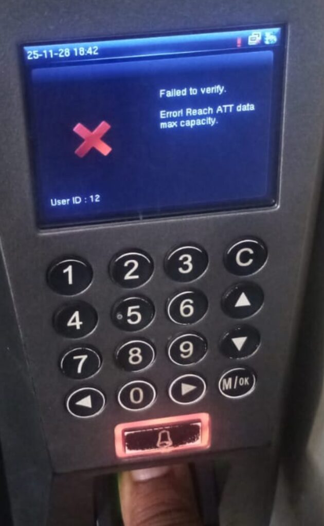 Simply put, the device storage is full, and no new attendance data can be recorded until space is cleared.